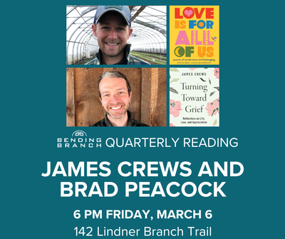 James Crews and Brad Peacock will visit us from Vermont to read from “Love is for All of Us” and “Turning Towards Grief.” This promises to be a special evening! As always, guests can enjoy delicious Bending Branch wines and cocktails.