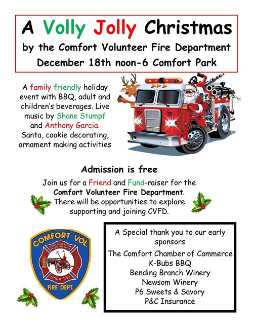 Join us at this community friend-raiser for the Comfort Volunteer Fire Department. Live music, BBQ, beer and wine, children's activities and SANTA!